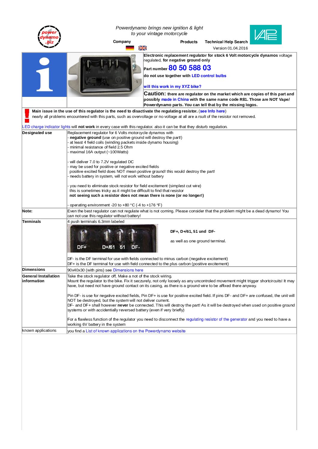 DC regulator for dynamo 6V DC for use in defined Motorcycles with negative ground.
